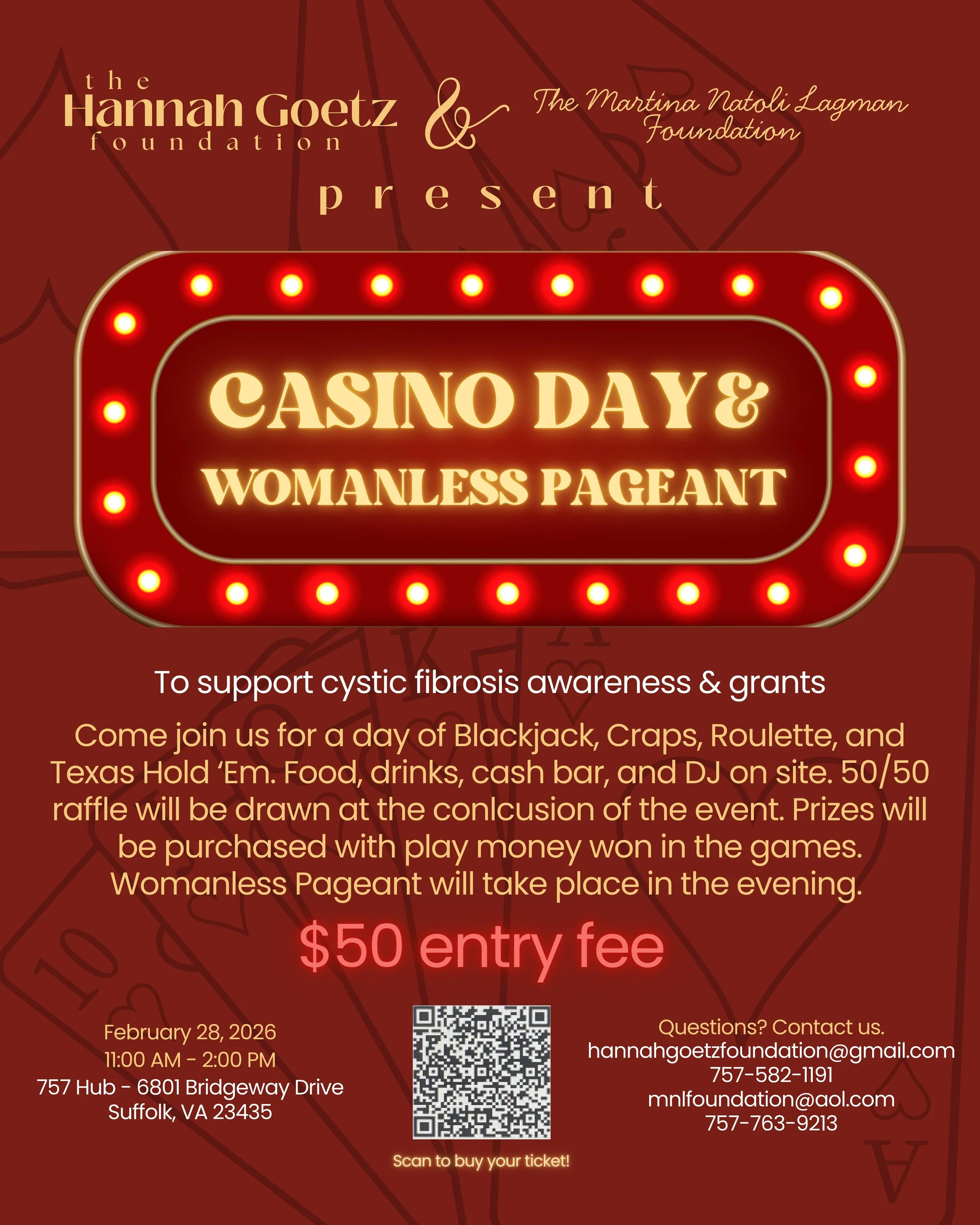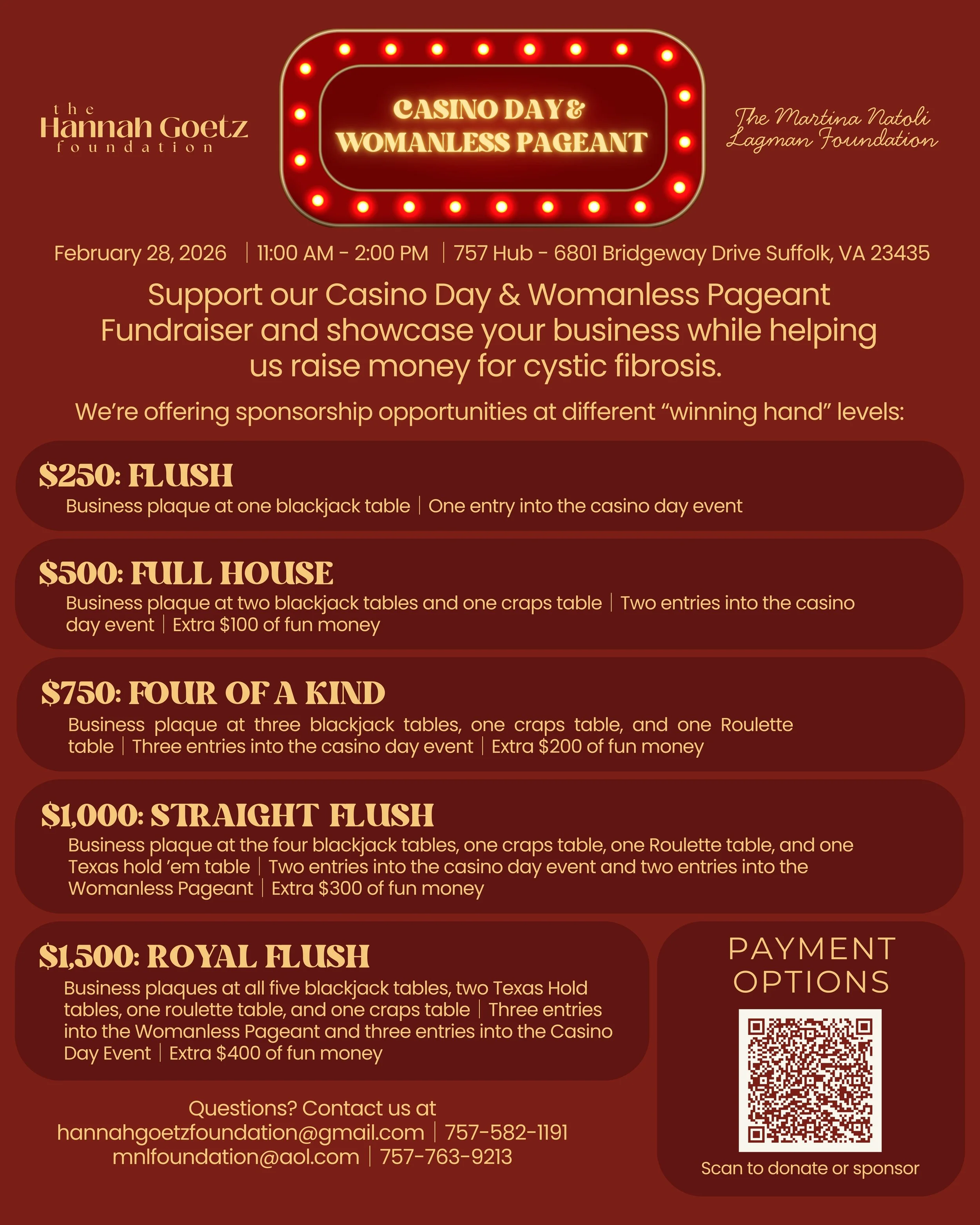 CASINO DAY & WOMANLESS PAGEANT CASINO DAY & WOMANLESS PAGEANT CASINO DAY & WOMANLESS PAGEANT Join us Febrary 28th for our Casino Day & Womanless Pageant fundraiser! Do you own or work for a business? We are looking for sponsorships! See second flyer for details.